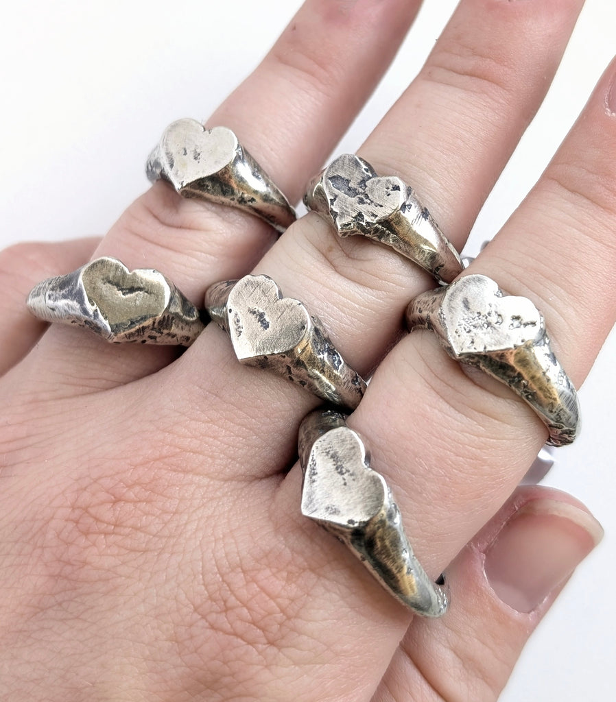 Casted rings are all one of a kind. They will each have unique markings and divots. These will not have gemstones. They are solid sterling silver and are 100% handmade.