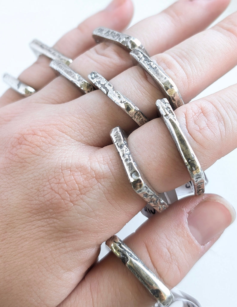 Casted rings are all one of a kind. They will each have unique markings and divots. These will not have gemstones. They are solid sterling silver and are 100% handmade.