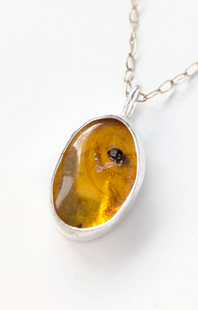 This is a one-of-a-kind necklace. It was built from sterling silver with fine silver bezel. If dropped, the stone could break. A 16" chain is provided.