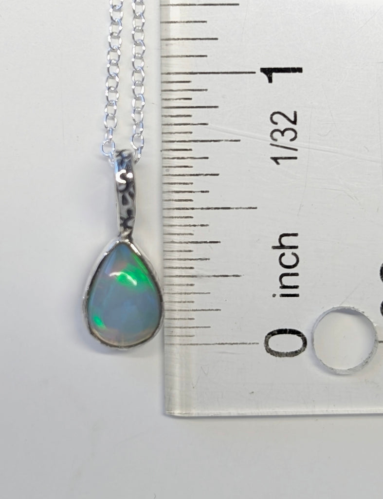This is a one-of-a-kind necklace. It was built from sterling silver with fine silver bezel. If dropped, the stone could break. A 16" chain is provided.