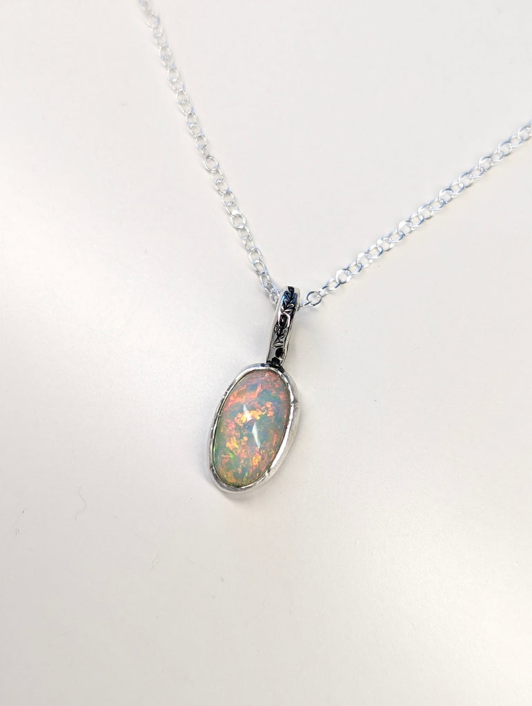 This is a one-of-a-kind necklace. It was built from sterling silver with fine silver bezel. If dropped, the stone could break. A 16" chain is provided.
