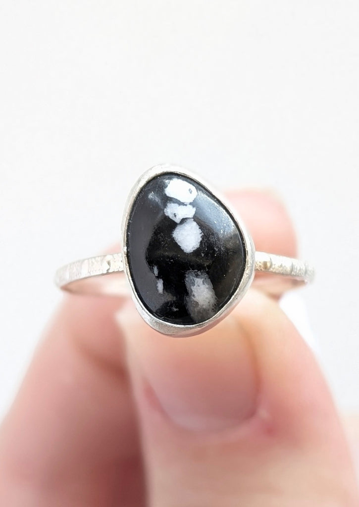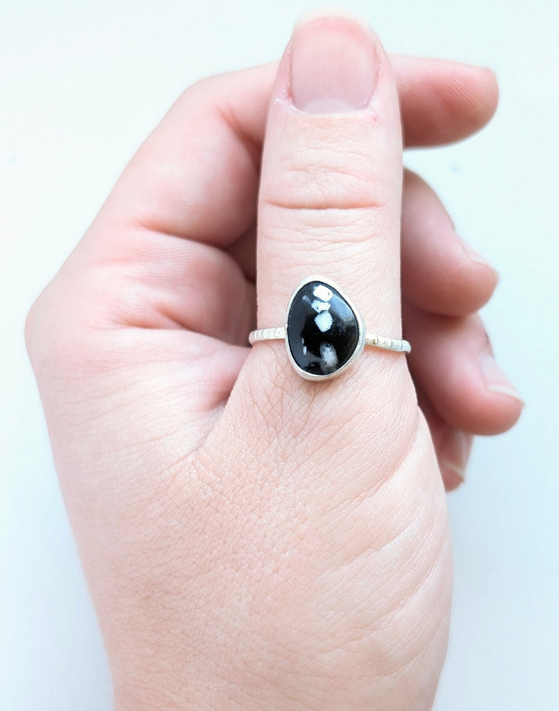 This is a one-of-a-kind ring. The entire setting was built from sterling silver. The stone was set by hand. If dropped, the stone could break.