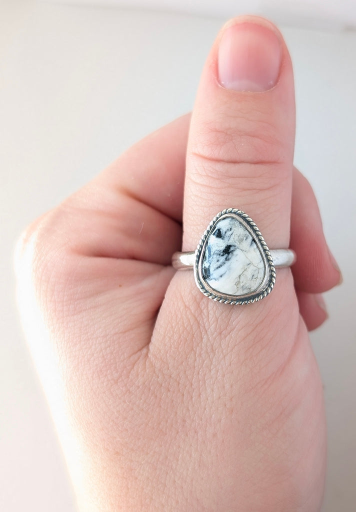 This is a one-of-a-kind ring. The entire setting was built from sterling silver. The stone was set by hand. If dropped, the stone could break.