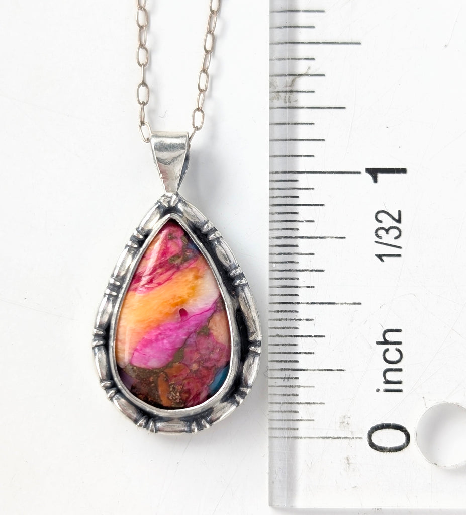 This is a one-of-a-kind necklace. It was built from sterling silver with fine silver bezel. If dropped, the stone could break. A 16" chain is provided.