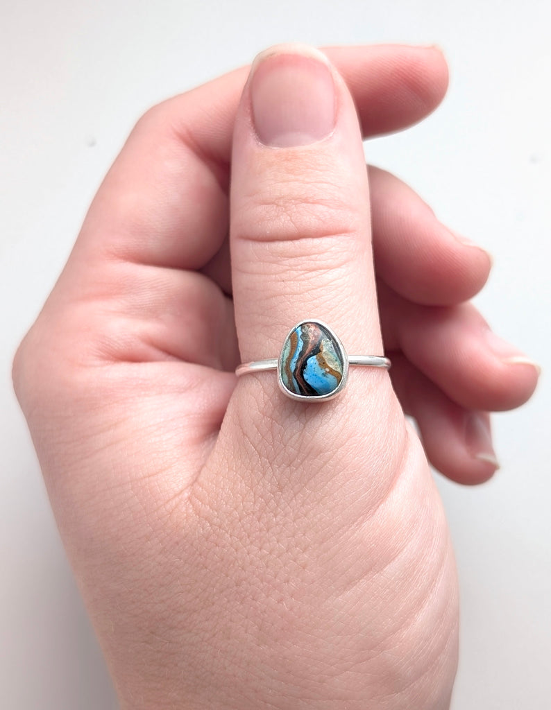 This is a one-of-a-kind ring. The entire setting was built from sterling silver. The stone was set by hand. If dropped, the stone may break.