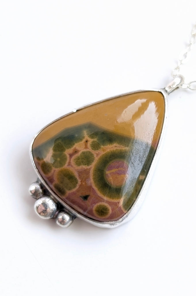This is a one-of-a-kind necklace. It was built from sterling silver with fine silver bezel. If dropped, the stone could break. A 16" chain is provided.