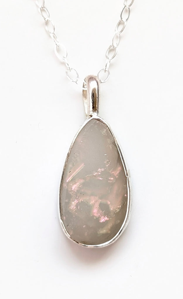 This is a one-of-a-kind necklace. It was built from sterling silver with fine silver bezel. If dropped, the stone could break. A 16" chain is provided.